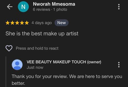 Vee Beauty Makeup Touch is a fast leading beauty hub where women are made to be and feel more beautiful. We also create a long lasting memory for our clients through our exceptional services.